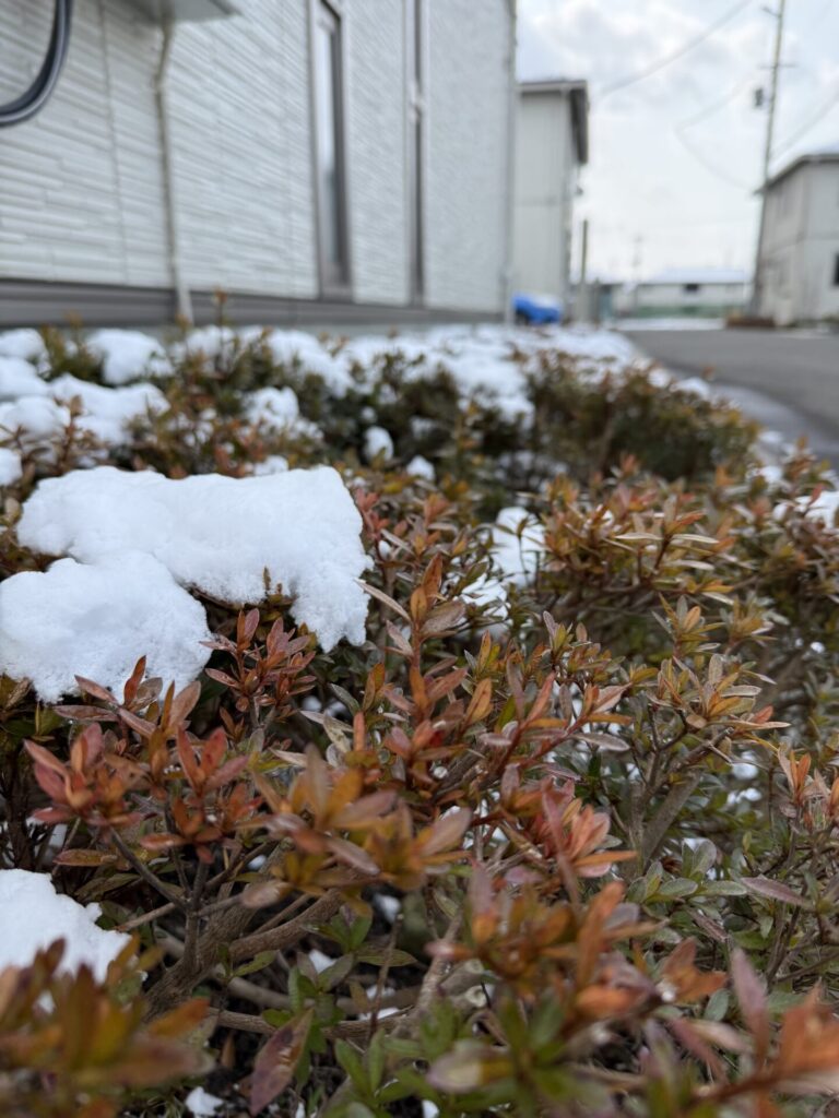 赤みを帯びた新芽と白い雪のコントラストがとても綺麗でしたので、思わずシャッターを切りました。