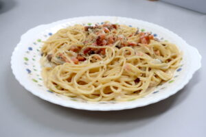 昨年度、管理釣り場で釣りましたトラウトサーモンをスモークサーモンに加藤先生がしてくれまして、本日、サーモンクリームスパゲッティとして楽しみました。非常に美味しかったです。あれだけたくさんあったサーモンも、残りわずかとなり、来月にはトラウトサーモンを補充しようと思います。