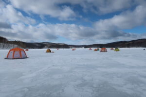 この岩洞湖は、冬には完全に結氷しますのでワカサギ釣りが可能となります。学生時代に2度程行ったことがありますが、20年振りくらいに釣行してきました。