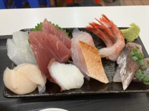 吉岡先生とのランチでは、本町市場の中にある魚屋さんが運営している定食屋さんによく行きます。ここは、流石に魚屋さんがやっているだけあって、鮮度のいい美味しいお刺身が堪能できます。今回も、ノドグロが入っていて大満足でした。