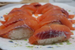 先日釣りました八幡平サーモントラウトを使って、当分野の加藤先生がお寿司を握ってくれました。ベテラン寿司職人かと感じるくらいの完璧な握りでした。美味しかったです。ありがとうございました。