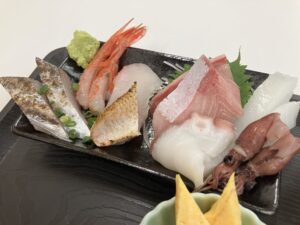 医学部の先生との共同研究でしたが、ランチの大部分は本町市場になる魚屋さんの定食です。ノドグロの炙りがなんしか美味しいです。 今のご時世、この厚みのあるお刺身を1500円で食べれるのはお得です。